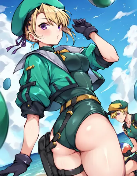 short hair, black gloves, hat, green jacket, short sleeves, green leotard, beret, green knee pads, cropped jacket, holster