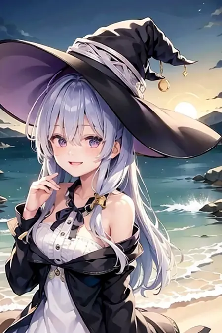 如果您想要她的经典服饰,请添加: bare shoulders ,white_collared shirt,yellow ribbon,witch hat,black robe,black skirt