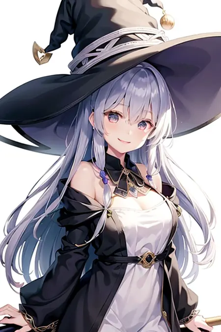 If you need her dress and personal adornment, please add : bare shoulders ,white_collared shirt,yellow ribbon,witch hat,black robe,black skirt