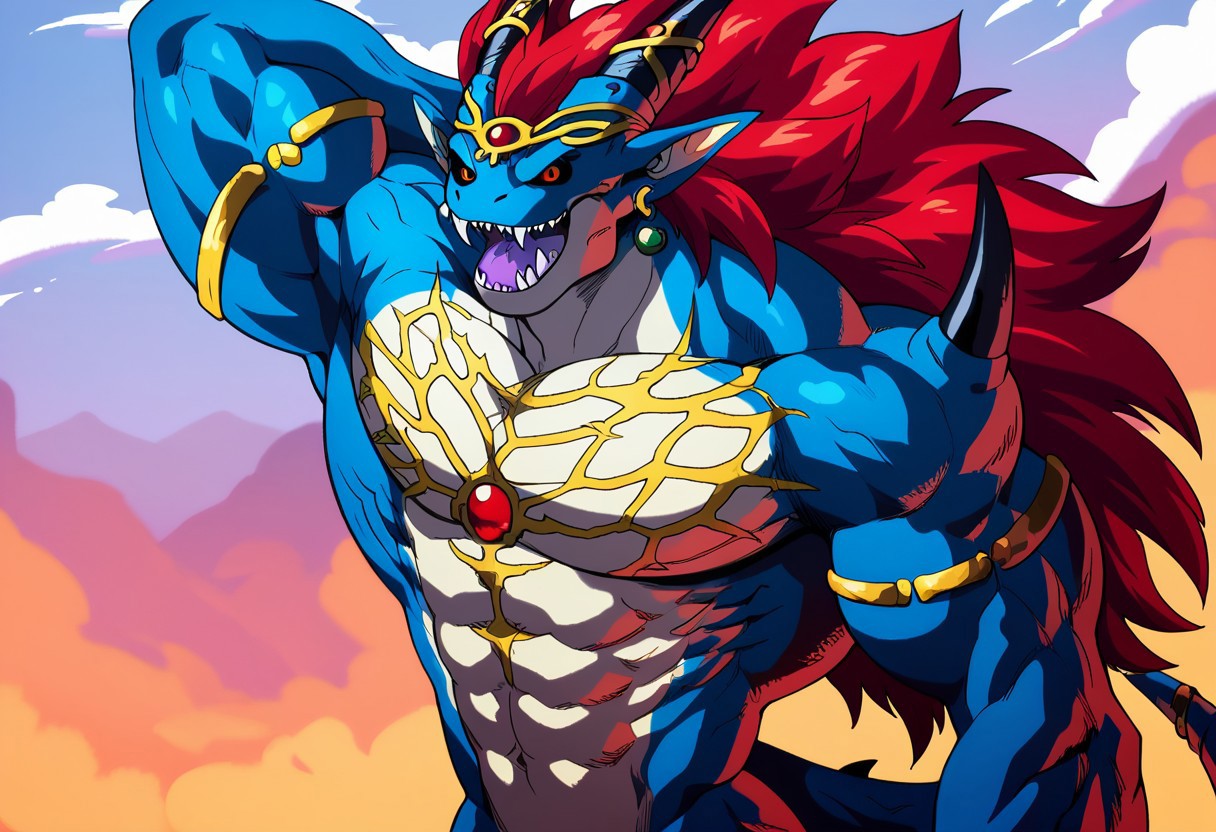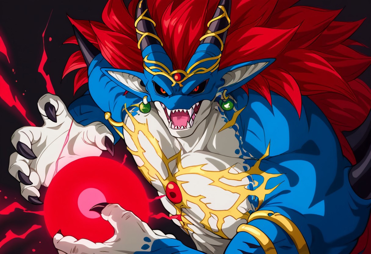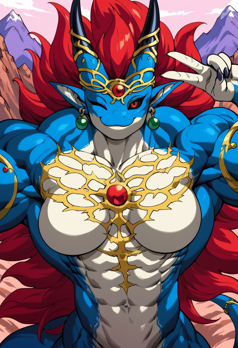 긍정적 프롬프트: DemigraTF, 괴물, 악마, 파란 몸체, 흰 몸체, 이색 몸체, 파란 비늘, 흰 비늘, 이색 비늘, 꼬리, 뿔, 발톱, 녹색 귀걸이, 보석, 머리 장식, 빨간 머리, 긴 머리, 빨간 눈, 검은 공막, 금색 팔찌, 날카로운 이빨, 송곳니