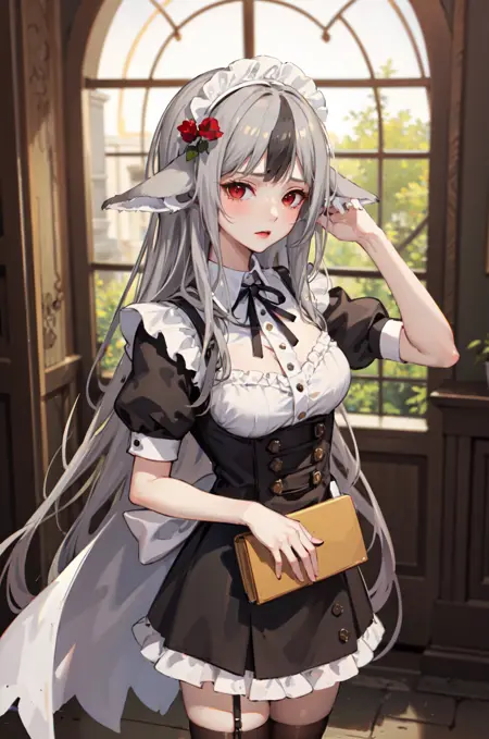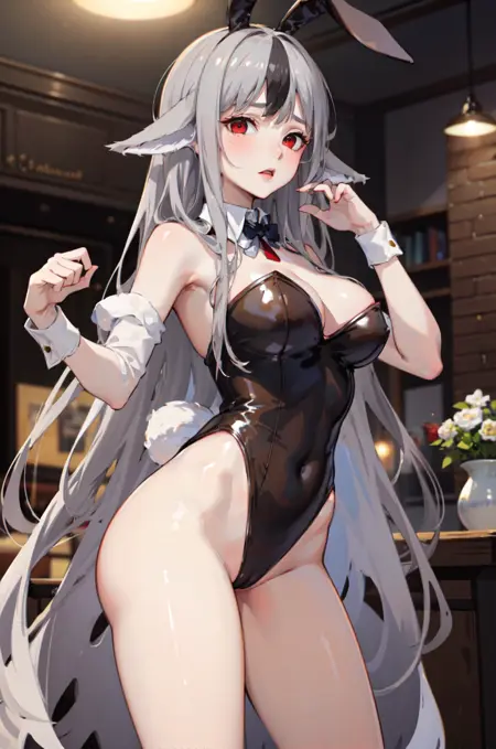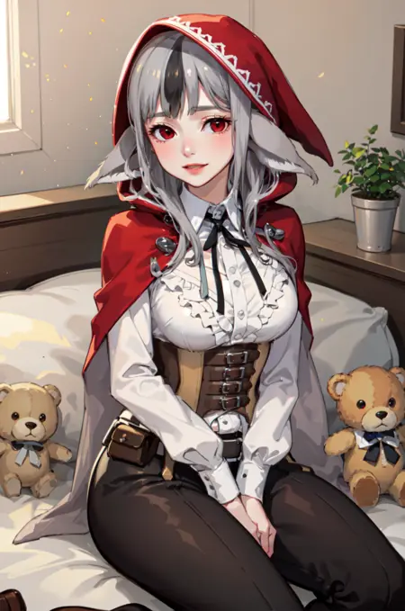 プロンプトに「赤い目、灰色の髪、カラフルな髪、動物の耳、赤いコート、パンツ」を追加することをおすすめします。