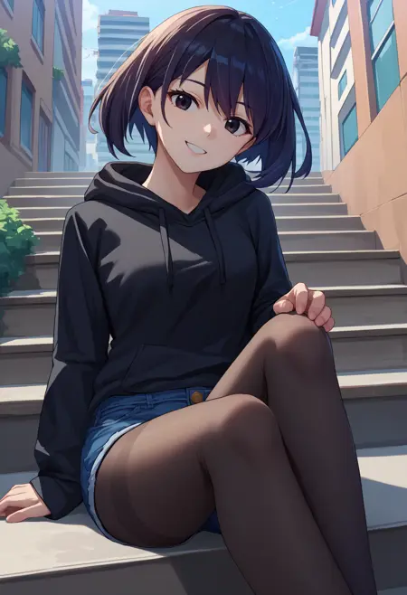 默认服装: 校服,黑色水手服,黑色上衣,黑色水手领,红色领巾,短袖,护臂,黑色短裙,百褶裙,红色腰带,黑色连裤袜