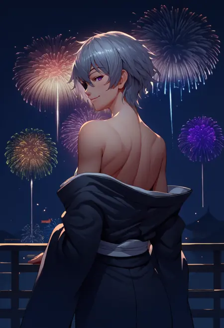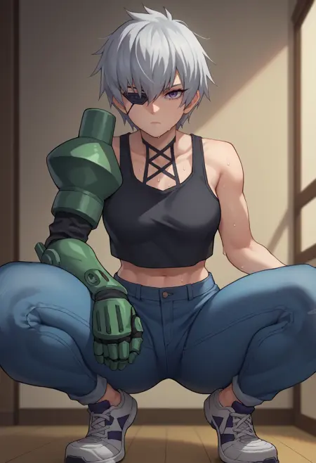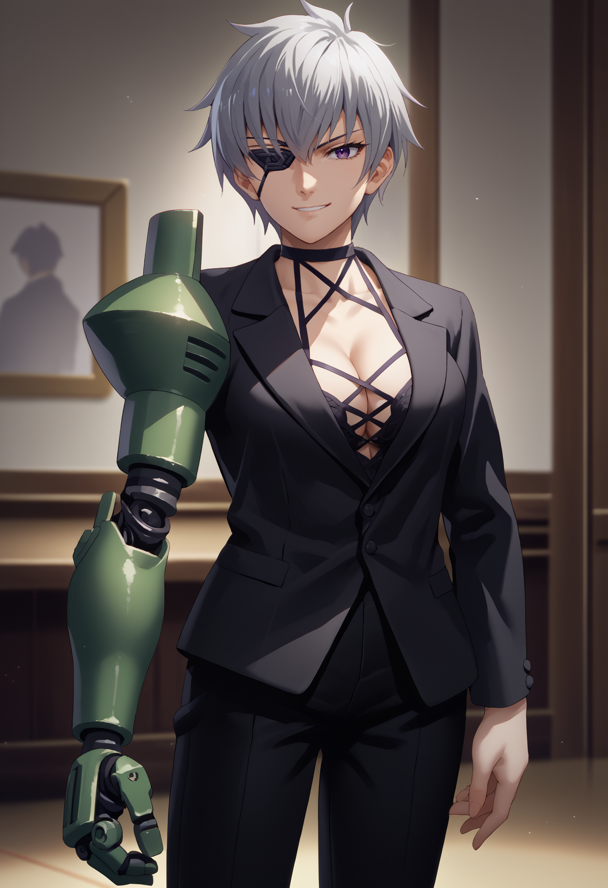 触发词 + 外观: agknajenda, 单机械臂, 灰发, 紫眼, 眼罩