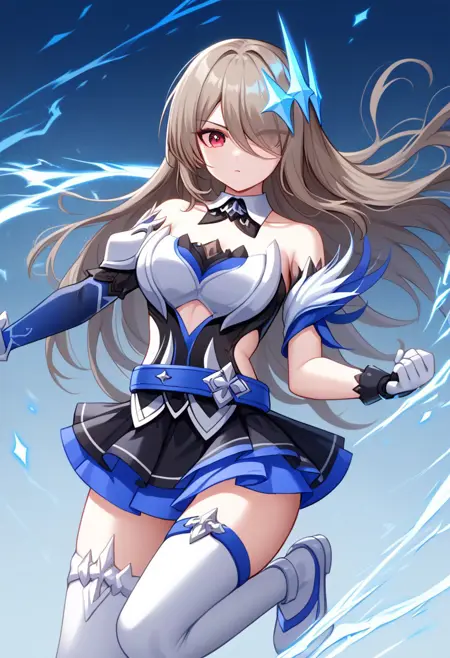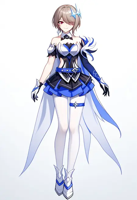 服装: 头饰, 腰带, 蓝色腰带, 护胸, 白色护胸, 中间开口, 衣服剪裁, 侧边剪裁, 无吊带, 无吊带上衣, 可拆卸领子, 黑蓝配色上衣, 层叠裙摆, 黑蓝配色短裙, 超短裙, 不对称手套, 白蓝配色手套, 大腿绑带, 手臂绑带, 不对称银蓝配色鞋履, 白色连裤袜, 翅膀斗篷