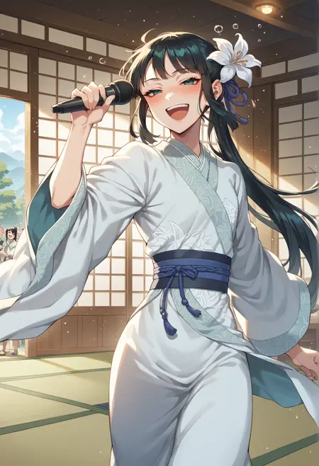 Notable tags: aqua eyes, long hair, black hair, low ponytail, chinese clothes, obi, hagoromo, long sleeves, wide sleeves, hair flower