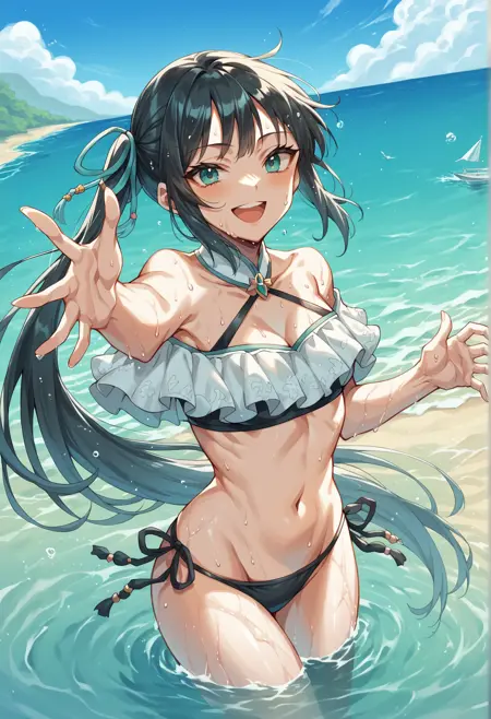 swimsuit: aqua eyes, long hair, black hair, hair ornament, side ponytail, bikini, frills, side-tie bikini bottom