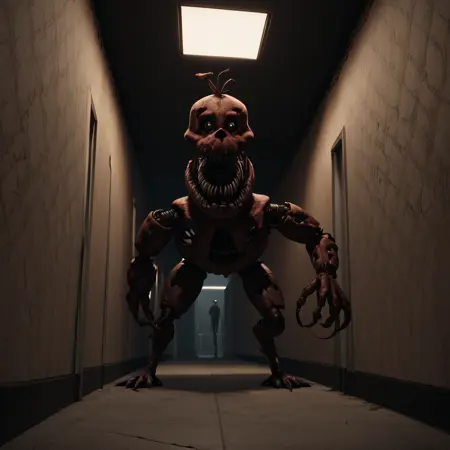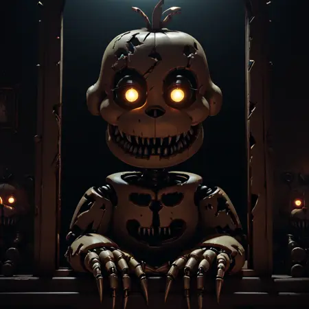 Positive Prompt: w1th3r3d, n1ghtm4re, tw1st3d, fnafstyle, score_9, score_8_up, score_7_up, score_6_up, animatronic, horror