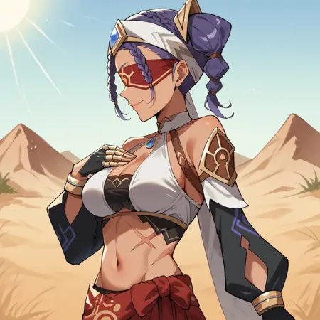 Eremite_CW, Jeht, 钻石发型, 双马尾, 紫色头发, 红色眼罩, 遮住眼睛, 深色皮肤, 深色皮肤女性, 腹部疤痕,