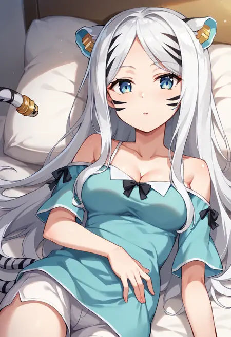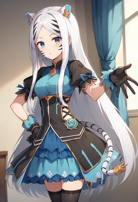 파란 눈, 하얀 머리, 긴 머리, 다채로운 머리, 얼굴 무늬, 호랑이 귀, 호랑이 꼬리, 전기 플러그
