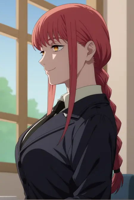 触发词:编发马尾辫,单独,黑色领带,有领衬衫,衬衫,白色衬衫,黑色西装,浅笑,有环的眼睛