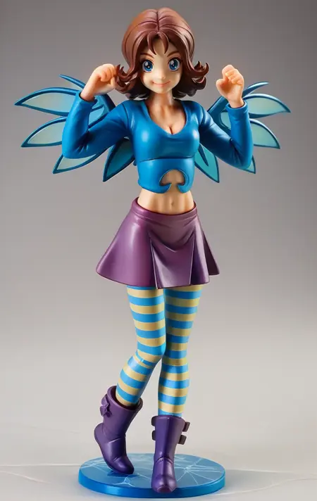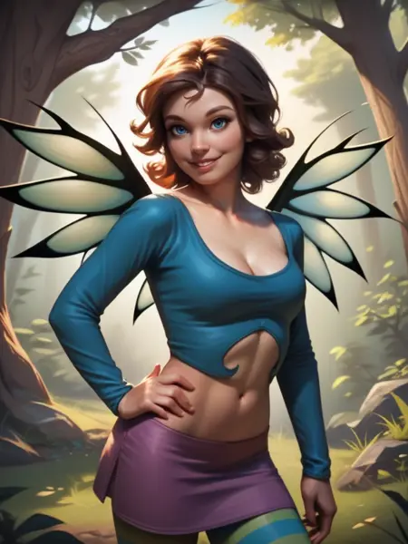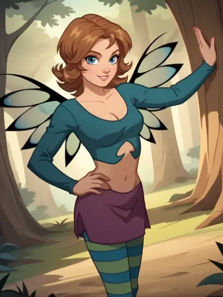 - 呼び出しワード PONY: "IrmaLair", "茶色の波状の髪、短髪、青い目、妖精の翼、縞模様のレギンス、お腹の露出、紫色のスカート、長袖、ブーツ、青いトップス、胸元"