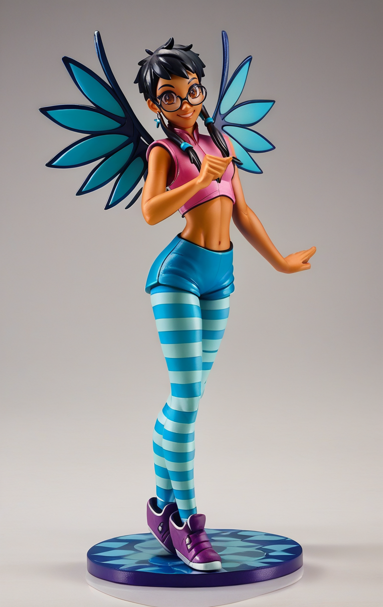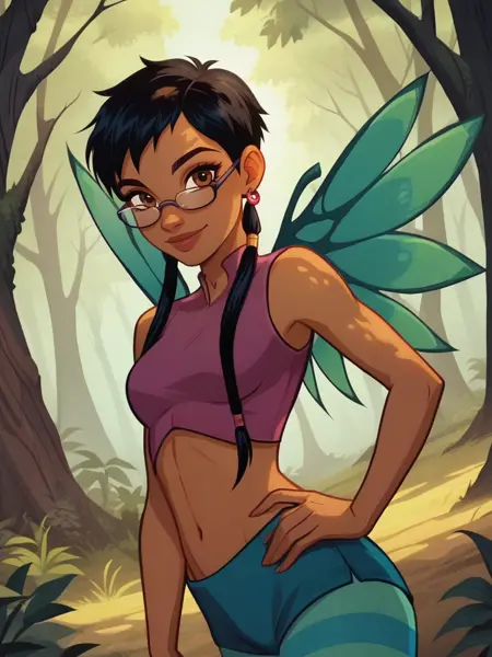 - 呼び出し語 PONY:"TaraneeCook", "肌の色が黒い女性、茶色の目、黒髪、短髪で長い髪の毛、メガネ、キャミトップ、ノースリーブ、青いショートパンツ、縞模様のストッキング、翼、イヤリング"