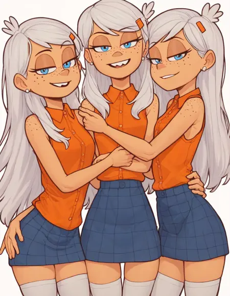 하얀 머리카락, 머리클립, 앞니, 주근깨, 주황색 셔츠, 소매 없는 셔츠, 파란 치마, 흰색 허벅지 양말, 귀걸이, 빨간 평지화