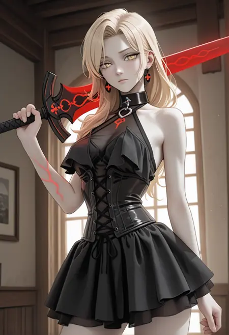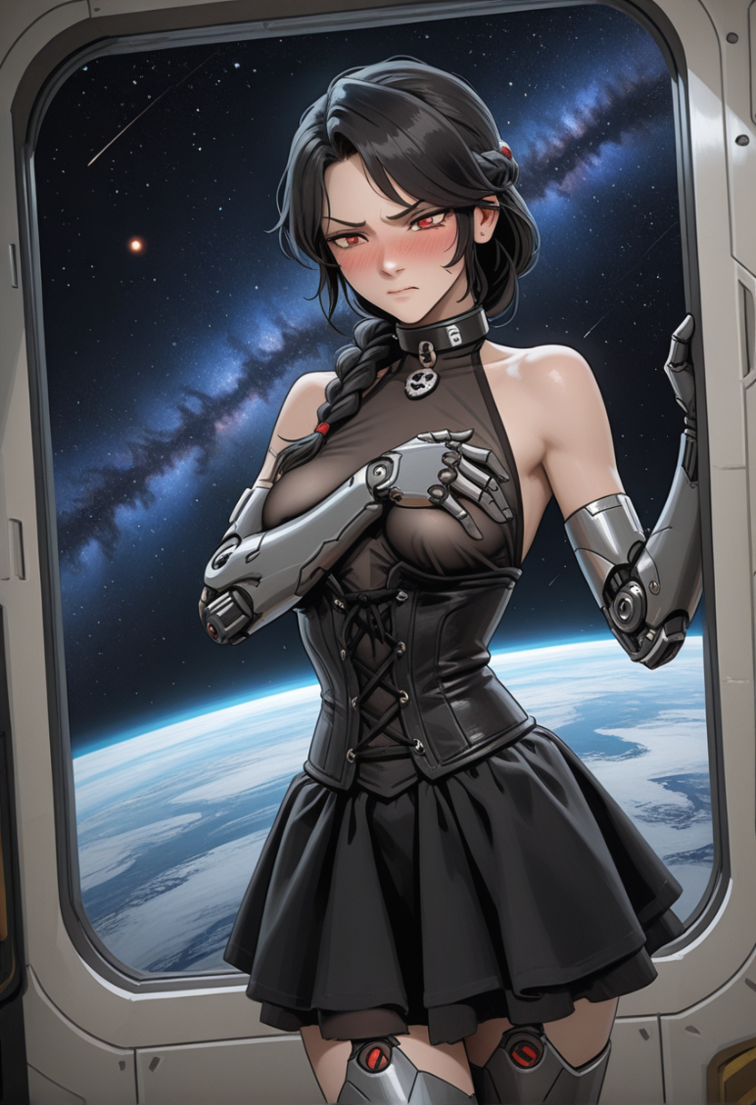 score_9, score_8_up, score_7_up, score_6_up, score_5_up, score_4_up, source_anime, solo, flat color, dark theme, 1girl, (mature female:1.5), s_s_h_o, black dress, short skirt, corset, chest lacing, collar, net under outfit, dynamic pose, looking at viewer