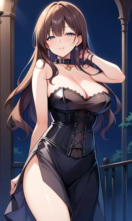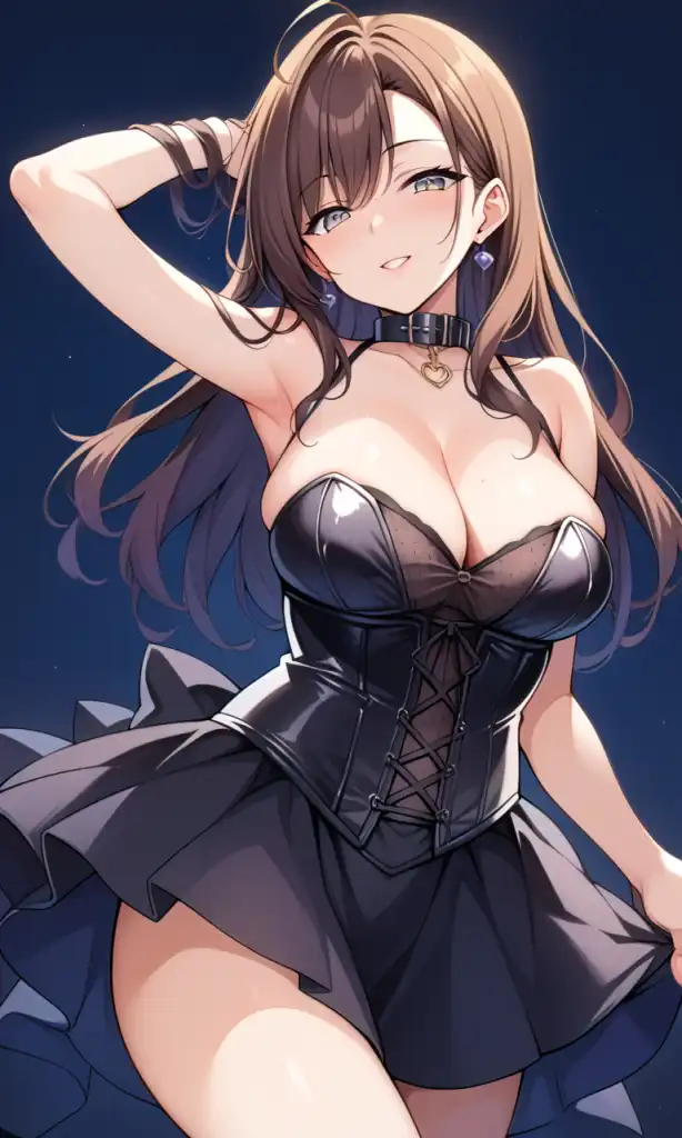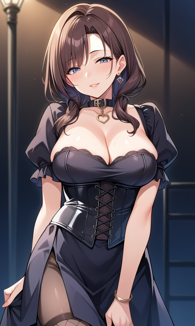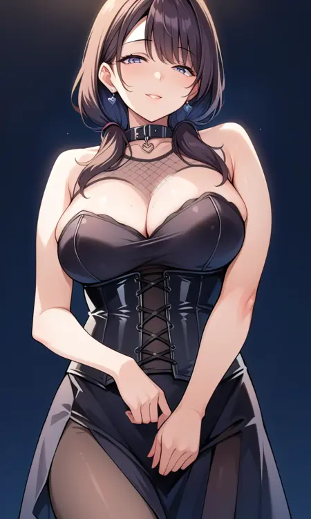 score_9, score_8_up, score_7_up, score_6_up, score_5_up, score_4_up, source_anime, solo, flat color, dark theme, 1girl, (mature female:1.5), s_s_h_o, black dress, short skirt, corset, chest lacing, collar, net under outfit, dynamic pose, looking at viewer