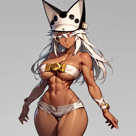 ramlethal valentine, long hair, cleavage, white hair, dark-skinned female, underboob, hat, cape, belt, orange eyes, short shorts, colored eyelashes, belt bra, thigh strap