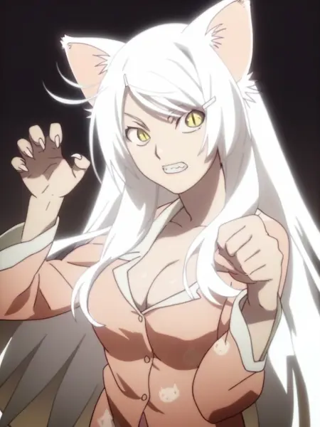hanekawa tsubasa, 1girl, cat girl, long hair, white hair, pink pajamas, hairclip, cat ears, slit pupils, yellow eyes