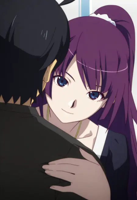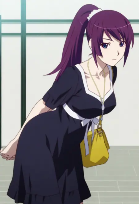 1girl, senjougahara hitagi, purple hair, blue eyes, long hair, ponytail,