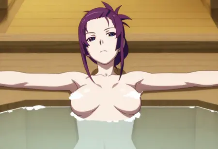 1girl, senjougahara hitagi, purple hair, forehead, hair up, alternate hairstyle,
