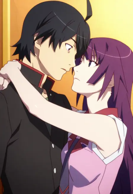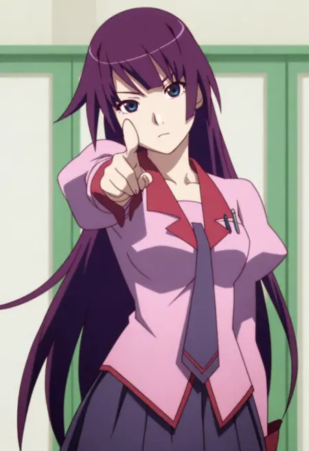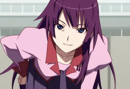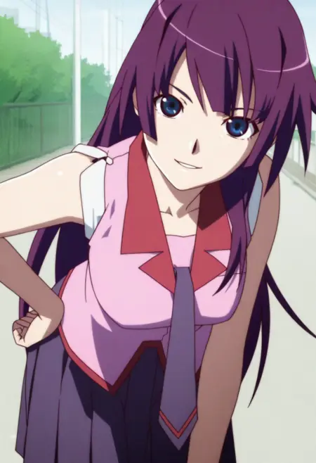 1girl, senjougahara hitagi, purple hair, blue eyes, long hair,
