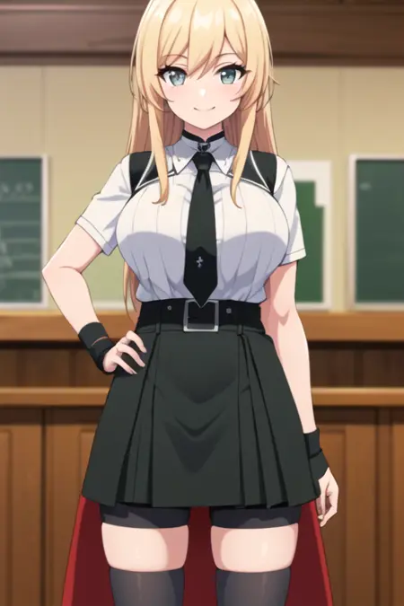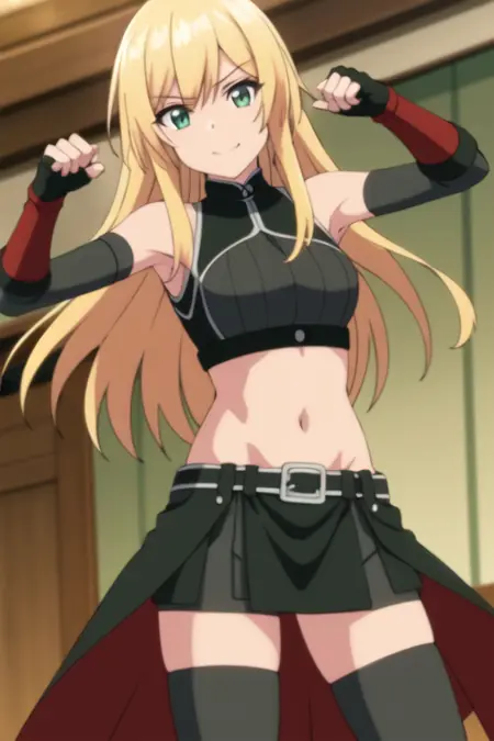 leila overlock, leila, bare_shoulders, blonde_hair, ore dake haireru, crop_top, detached_sleeves, elbow_gloves, fingerless_gloves, gloves, long_hair, midriff, navel, skirt, bike_shorts, thighhighs,