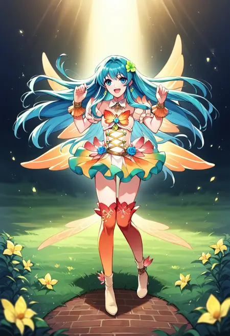 Resplendent Outfit: RFit, green hair flower, jewelry, green earrings, gradient clothes, multicolored dress, detached sleeves, puffy short sleeves, bare shoulders, butterfly wing cape, orange wrist cuffs, multicolored skirt, miniskirt, zettai ryouiki, gradient legwear, high heels, bracelet, bracer,