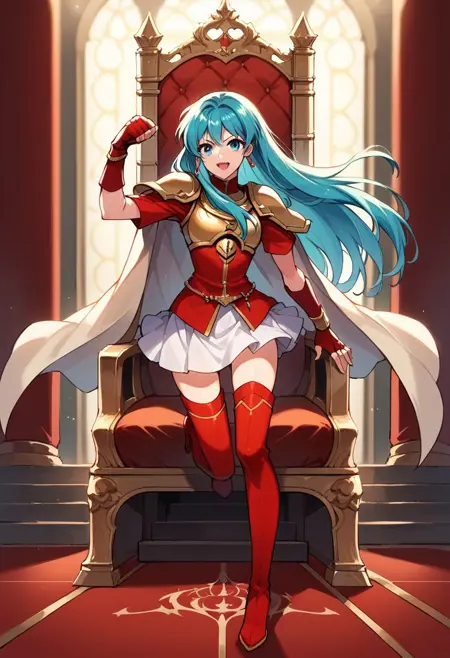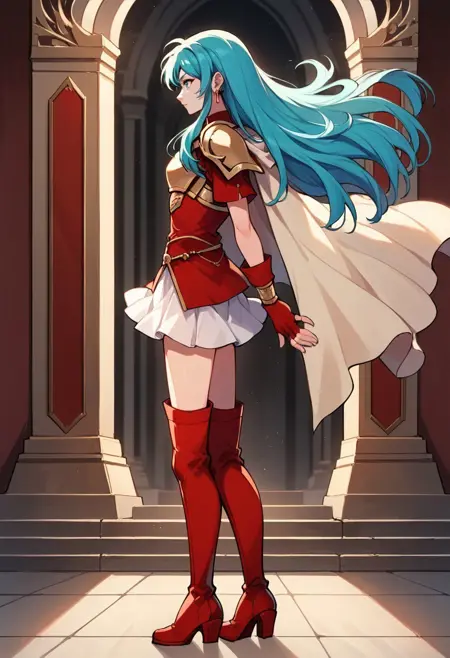Brave Outfit (aka Ephraim Outfit): EFit, high ponytail, hair ornament, jewelry, earrings, chest guard, breastplate, shoulder pads, turtleneck, short aqua dress, long sleeves, brown elbow gloves, bracer, brown belt, white skirt, two-tone cape, red cape, black cape, white thighhighs, black thigh boots, armored boots, zettai ryouiki,