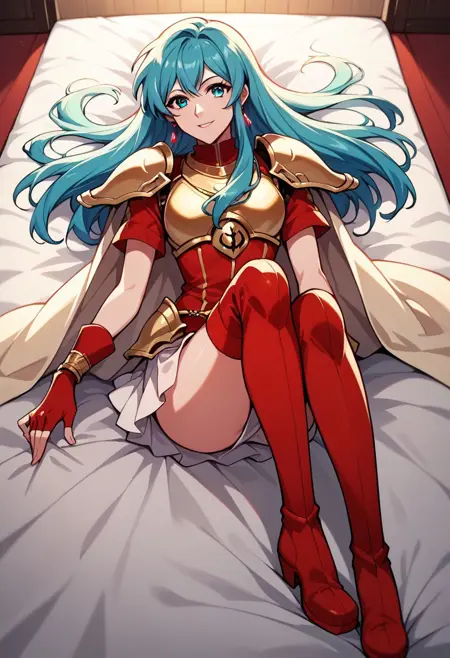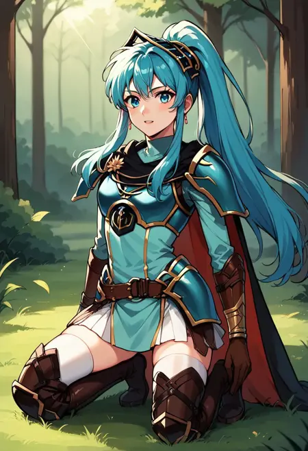 英勇服装(又称埃弗拉姆服装): EFit,高马尾,发饰,珠宝,耳环,胸甲,胸板,肩垫,高领,短水色连衣裙,长袖,棕色肘套,护臂,棕色腰带,白色裙子,双色斗篷,红色斗篷,黑色斗篷,白色过膝袜,黑色大腿靴,护甲靴,绝对领域,