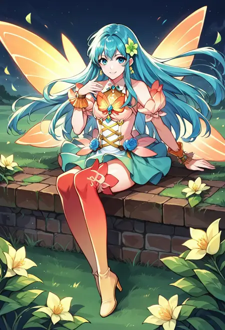 华丽服装: RFit,绿色发花,珠宝,绿色耳环,渐变服饰,多彩连衣裙,可拆卸袖子,蓬松短袖,露肩,蝴蝶翼斗篷,橙色腕带,多彩裙子,迷你裙,绝对领域,渐变裤装,高跟鞋,手镯,护臂,