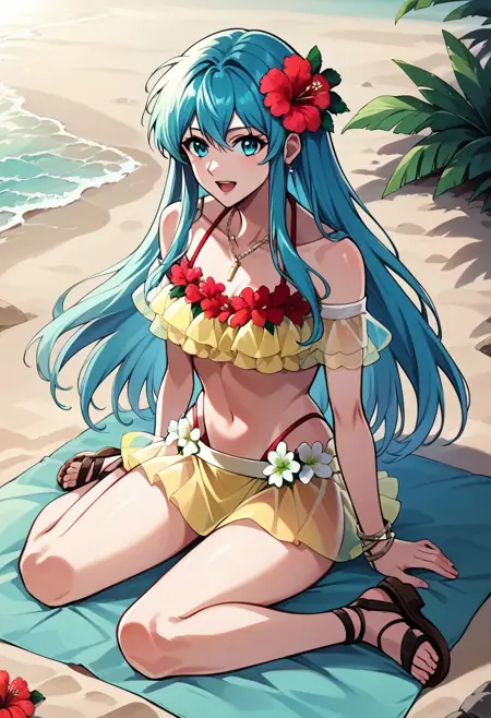 Summer Outfit: SFit, hair flower, swimsuit, bare shoulders, jewelry, necklace, earrings, layered bikini, two-tone bikini, red bikini, yellow bikini, off-shoulder bikini, bead bracelet, bikini skirt, frills, frilled bikini, hibiscus, sandals, see-through, highleg bikini,