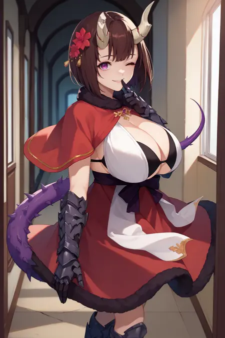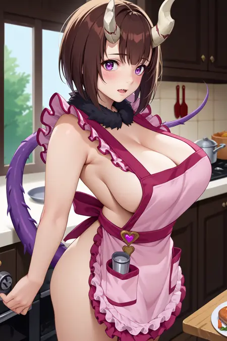 バレンタインバージョンには、"valEko, brown hair, short hair, bob cut, broken horn, demon horns, purple eyes, fur collar, pink apron, frilled apron, cleavage, red skirt, fur trim, gauntlets" を追加してください。(「red skirt, fur trim」を「naked apron」に置き換えると、裸のエプロンになります…)