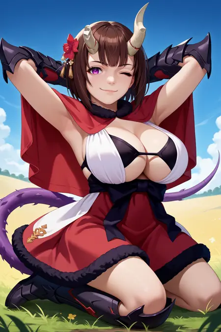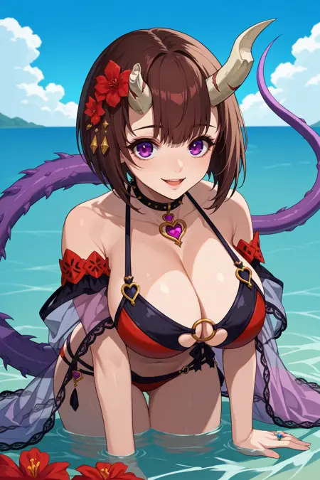 夏バージョンには、"summerEko, brown hair, short hair, bob cut, broken horn, demon horns, purple eyes, hair flower, hair ornament, red flower, black choker, heart choker, black and red bikini, o-ring bikini, multi-strapped bikini bottom, see-through shawl, ring" を追加してください。