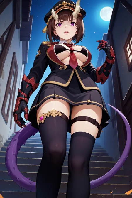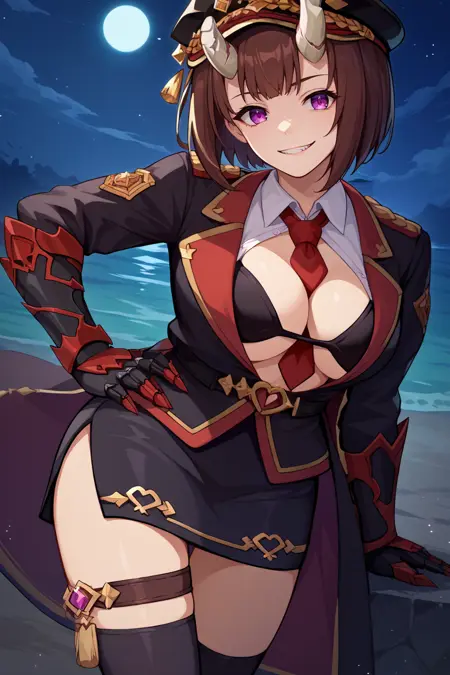 司令官バージョンには、"cdrEko, brown hair, short hair, bob cut, broken horn, demon horns, purple eyes, peaked cap, black hat, black jacket, collared shirt, red necktie, necktie between breasts, black gauntlets, black bra, black skirt, thigh strap, black thighhighs" を追加してください。