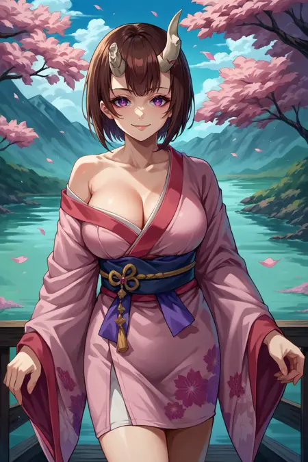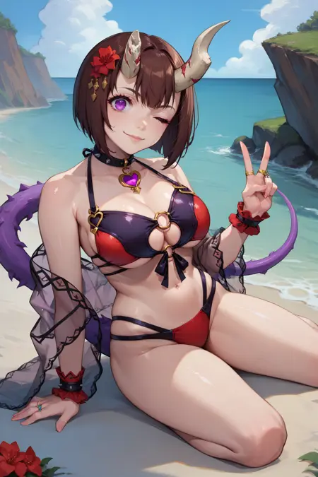 Add "summerEko, brown hair, short hair, bob cut, broken horn, demon horns, purple eyes, hair flower, hair ornament, red flower, black choker, heart choker, black and red bikini, o-ring bikini, multi-strapped bikini bottom, see-through shawl, ring" for her Summer alt.