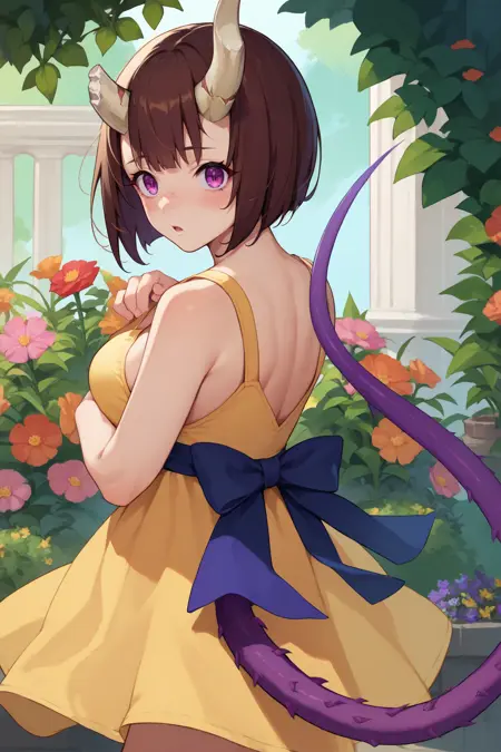 "Purple tail, spiked tail" を追加すると、彼女の尾が描かれます。