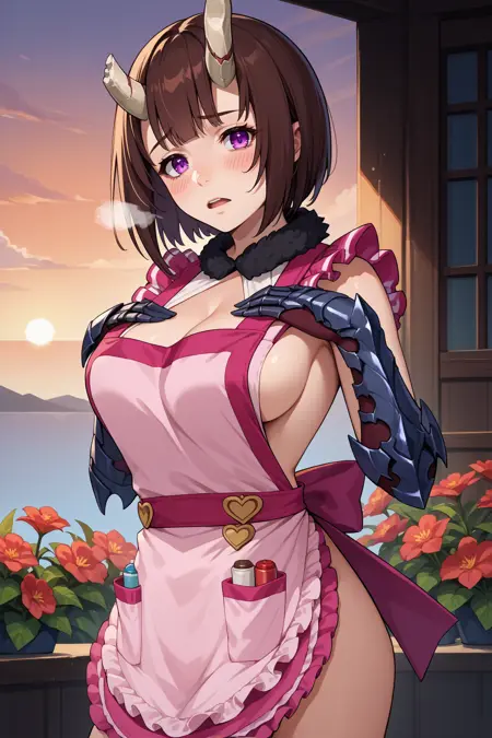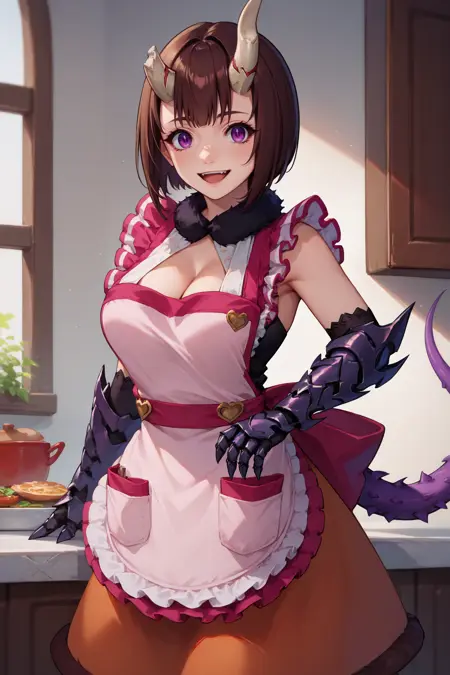 Add "valEko, brown hair, short hair, bob cut, broken horn, demon horns, purple eyes, fur collar, pink apron, frilled apron, cleavage, red skirt, fur trim, gauntlets" for her Valentine alt. (Replace "red skirt, fur trim" with "naked apron" to turn it into a naked apron...)