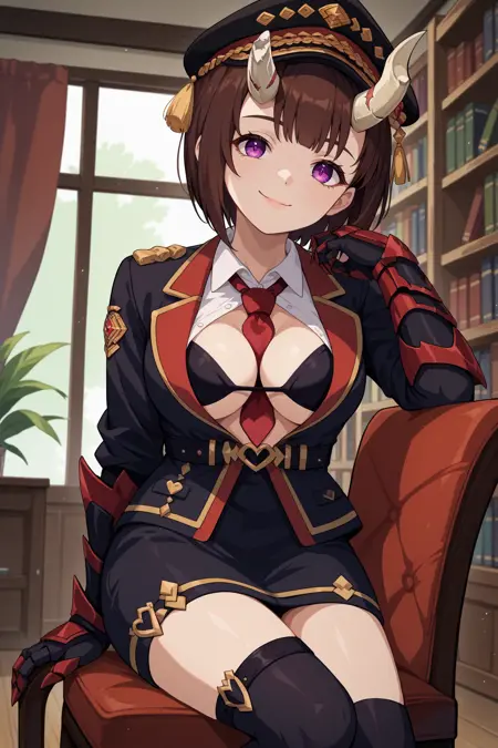Add "cdrEko, brown hair, short hair, bob cut, broken horn, demon horns, purple eyes, peaked cap, black hat, black jacket, collared shirt, red necktie, necktie between breasts, black gauntlets, black bra, black skirt, thigh strap, black thighhighs" for her Commander alt.