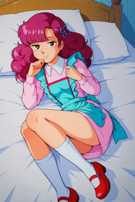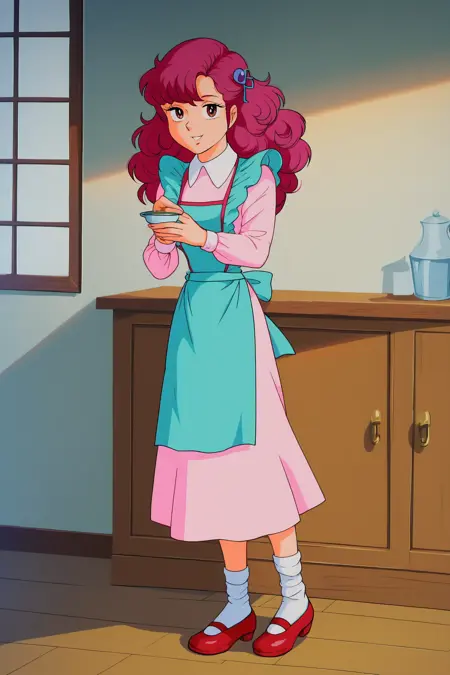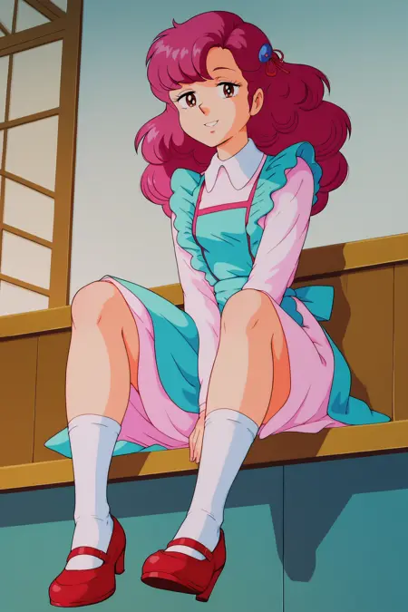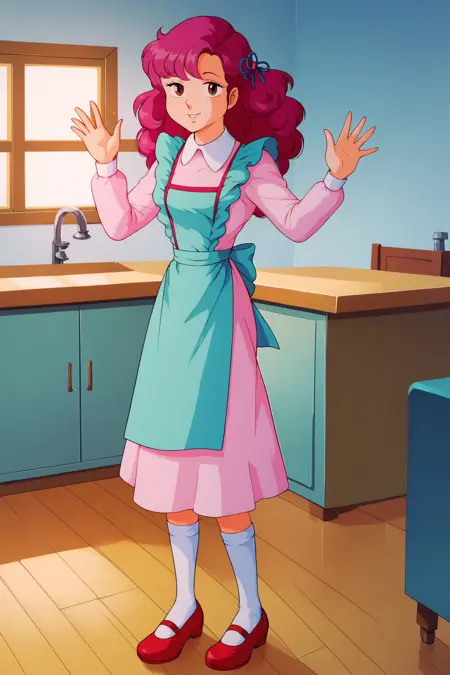 ➜ RanUYXL, retro artstyle, brown eyes, pink hair, long hair, bangs, hair ornament, small breasts, white shirt collar, pink dress, long sleeves, aqua apron, pink skirt, white socks, red shoes