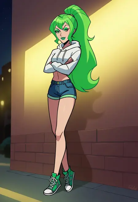 通用提示词:EElosh,绿发,长发,绿眼,绿色巩膜,眼影,绿唇,额饰,妆容,项圈,宝石,多色紧身衣,全身袜,宽袖,绿色大腿袜,绿色大腿靴,绿色鞋履,