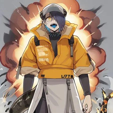 オプション:短い髪、青い髪、鋭い歯、色のついた舌、片方の目に髪をかけた、アイパッチ、トカゲの尾、黄色いジャケット、黒いボディスーツ、スニーカー、白いベースボールキャップ