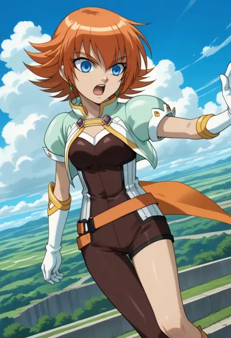 bakugan, bakugan new vestroia, mira clay, 1girl, solo, blue eyes, gloves, orange hair, cloud, short hair,single stocking,