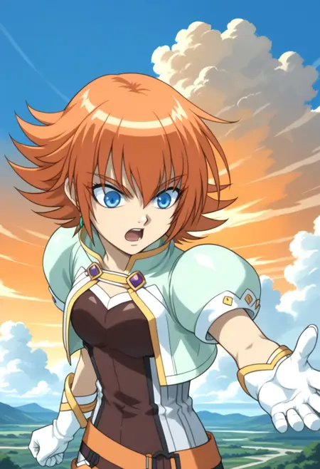 提示:爆丸,爆丸新维斯特罗亚,米拉·克莱,1个女孩,单独,蓝眼睛,手套,橙色头发,云,短发,单只长筒袜