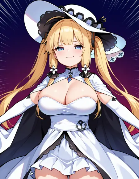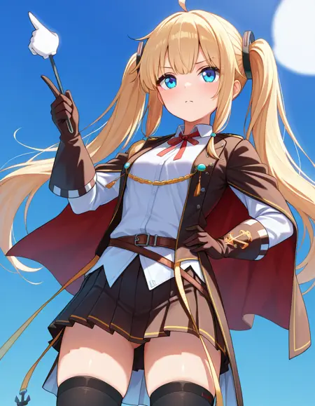 推奨プロンプト:1girl、青い目、金髪、あほ毛、ツインテール、プリーツスカート、黒タイツ、手袋、シャツ、首リボン、軍服、マント、長袖、アンカーの装飾、髪飾り、ブーツ