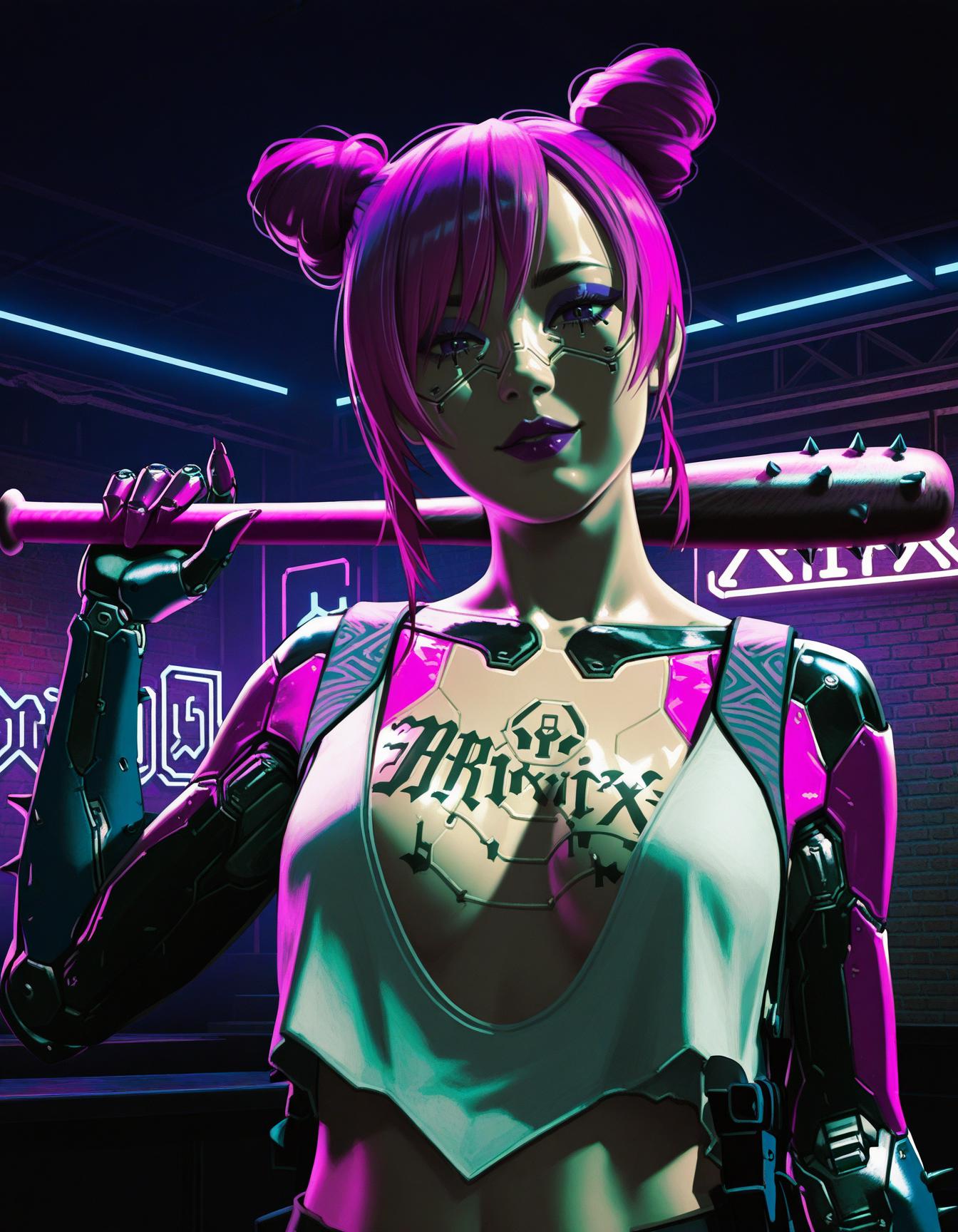 xritax, pink hair, double bun, purple lips, makeup, cyberpunk