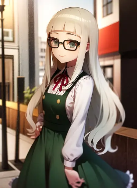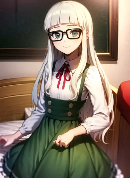 pinafore dress, green dress, white shirt,frilled sleeves, red ribbon, neck ribbon, glasses, black-framed eyewear