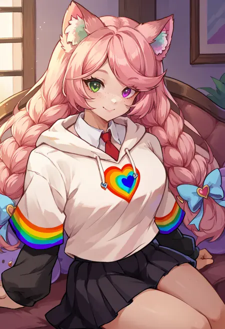 EveryLunaEver, heterochromia, freckles, animal ears, long hair, twin braids, hair bow, wing collar, red necktie, white hoodie, print hoodie, heart print, layered sleeves, short over long sleeves, black sleeves, black skirt