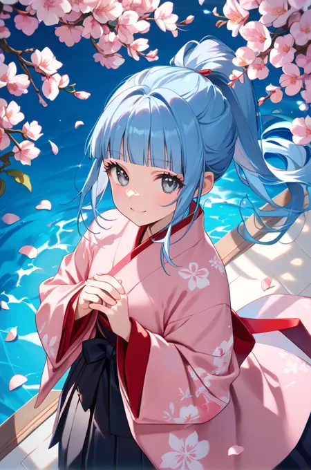 angeBase, blue hair, blunt bangs, ponytail, high ponytail, grey eyes, long hair,