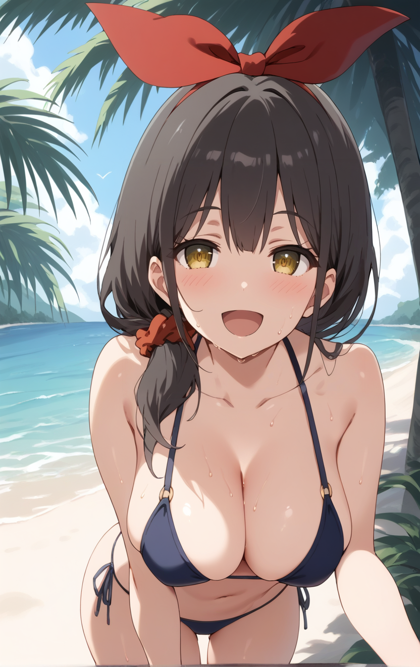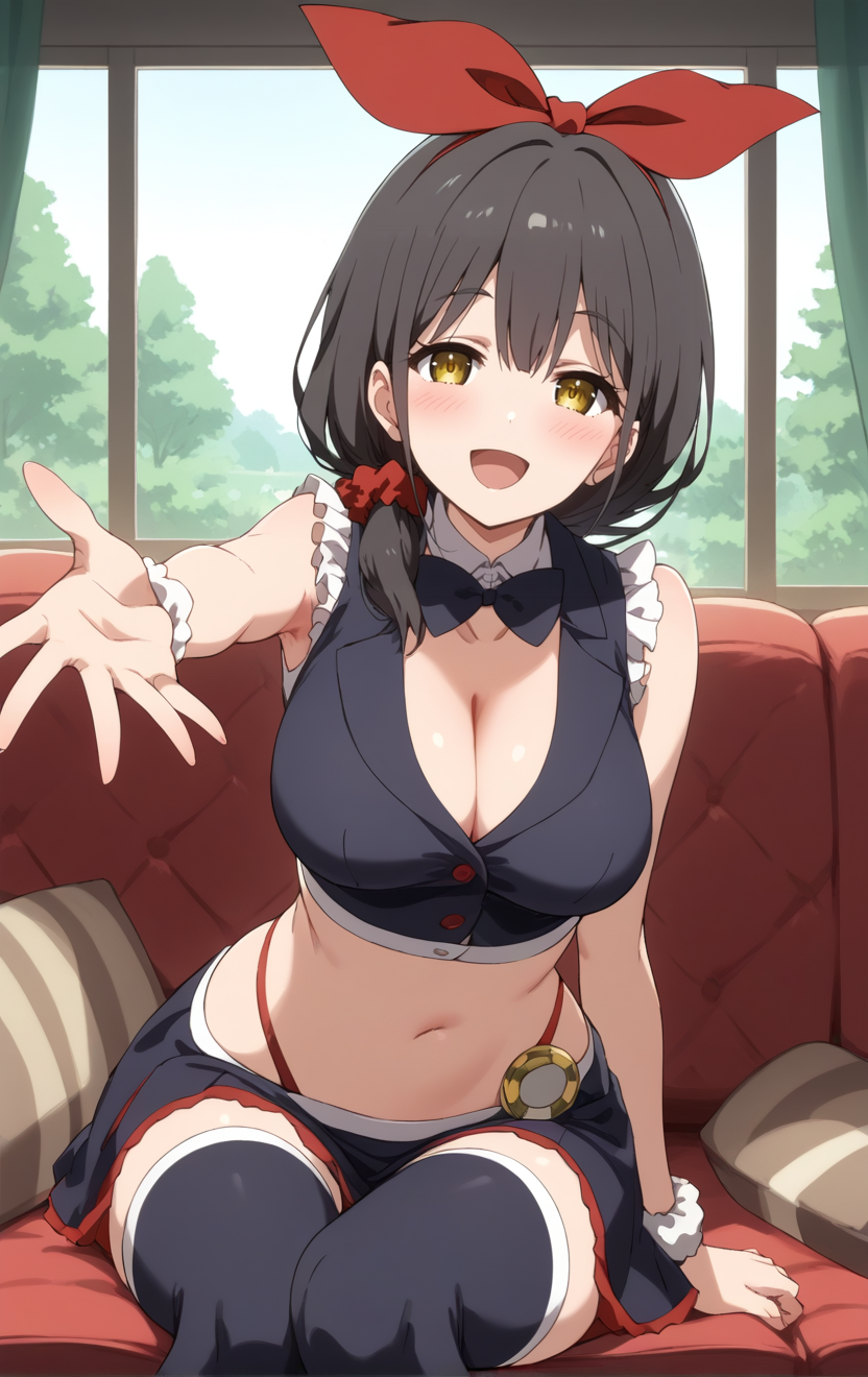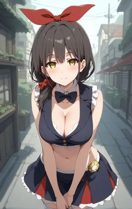 ,yellow eyes,(green eyes:0.8),black hair,brown hair,hair ribbon,red ribbon, hair scrunchie,midriff,cleavage, miniskirt,sleeveless,thighhighs,looking at viewer,standing,lora:AkibaMeid\_PorkerMeidMob:1