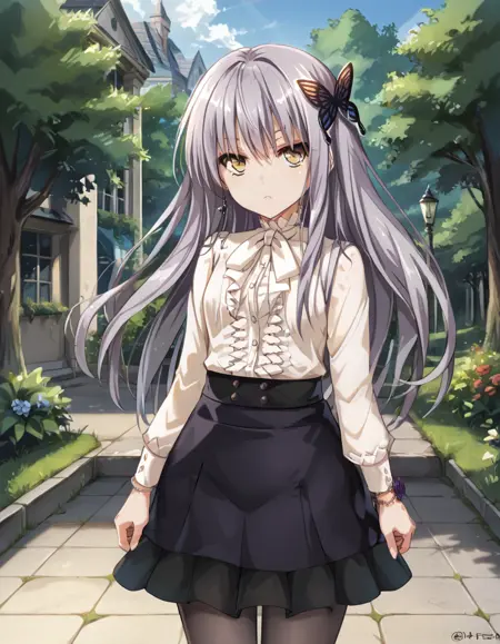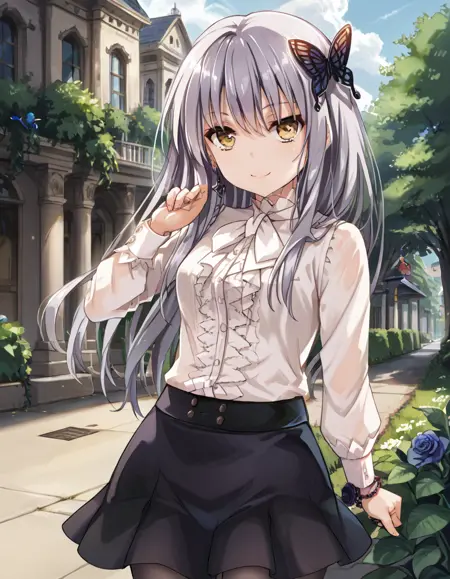 유키나디프, 나비 모양 헤어 액세서리, 장미 팔찌, 셔츠, 흰 셔츠, 스커트, 팬티스타킹