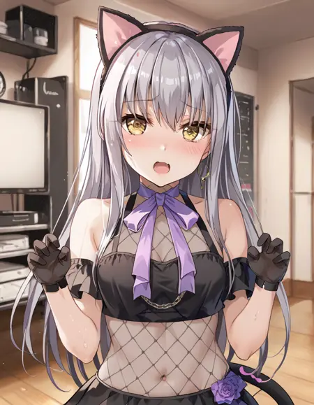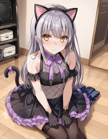 유키나캣, 캣 드레스, 어깨 드러난 드레스, 고양이 귀, 캣 목 도장, 캣 장갑, 캣 가짜 동물 귀, 캣 스트래트, 캣 꼬리, 꼬리 리본